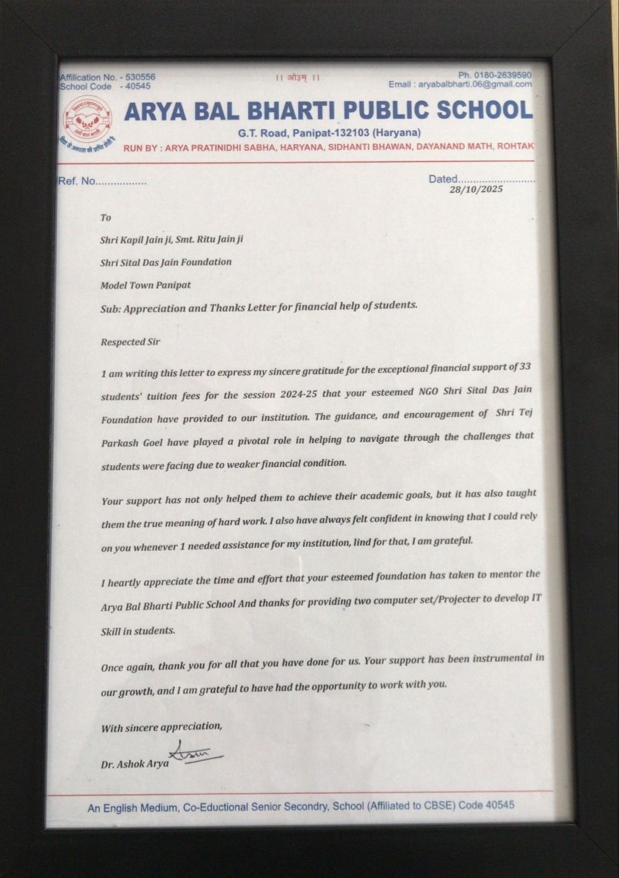 I am writing this letter to express my sincere gratitude for the generous financial support of ₹1,00,000 extended by the Shri Shital Das Jain Foundation. Your assistance has enabled me to pursue my current semester of B.Tech in Computer Science (AI) at Chitkara University without any financial stress.
